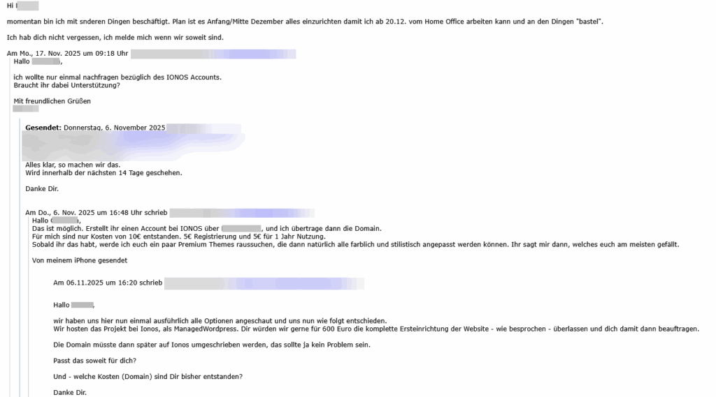 Der Kunde sagt, er will nur die Website, aber das Hosting nicht. Innerhalb von 2 Wochen würde ich dann den Zugang zu dem Hostingprovider seiner Wahl bekommen.
